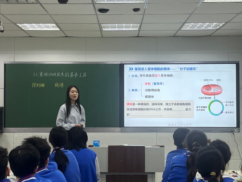 活动伊始,来自 的郭飞宇老师带来了《重组DNA技术的基本工具》新授课展示。郭老师紧扣核心素养培育目标,以“重组人胰岛素构建”为贯穿始终的真实情境,巧妙运用建构主义与直观性教学理论,设计“剪刀模拟限制酶切割”“胶带模拟DNA连接酶连接”等具象化实践活动,将微观的分子操作转化为看得见、摸得着的课堂体验。课堂上,师生互动热烈,学生在动手建模与问题探究中深刻理解了基因工具的作用机理,充分展现了“教、学、评”一体化的教学理念,为抽象内容的教学提供了优质示范。
