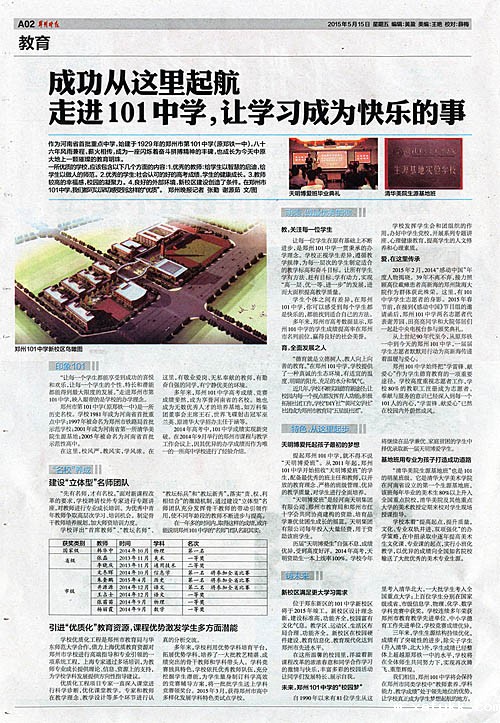 2014年高考中,101中学成绩实现新突破。在2014年9月举行的郑州市课程与教学工作会议上,因其优异的办学成绩而作为唯一的一所高中学校进行了经验介绍。