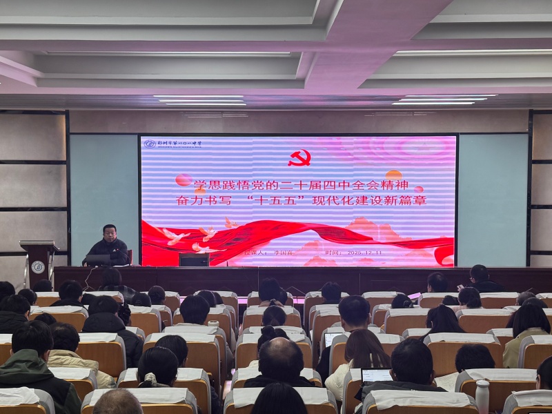 为深入贯彻落实郑州市教育系统关于学习宣传党的二十届四中全会精神的工作部署,切实把全校教职工的思想和行动统一到党中央决策部署上来,12月11日,郑州市第一○一中学召开全体教工大会。学校党委书记李国喜以“学思践悟党的二十届四中全会精神 奋力书写‘十五五’现代化建设新篇章”为题作专题宣讲报告,为全体教师送上了一堂内涵深刻、催人奋进的理论党课,拉开了学校全面学习贯彻全会精神的序幕。
