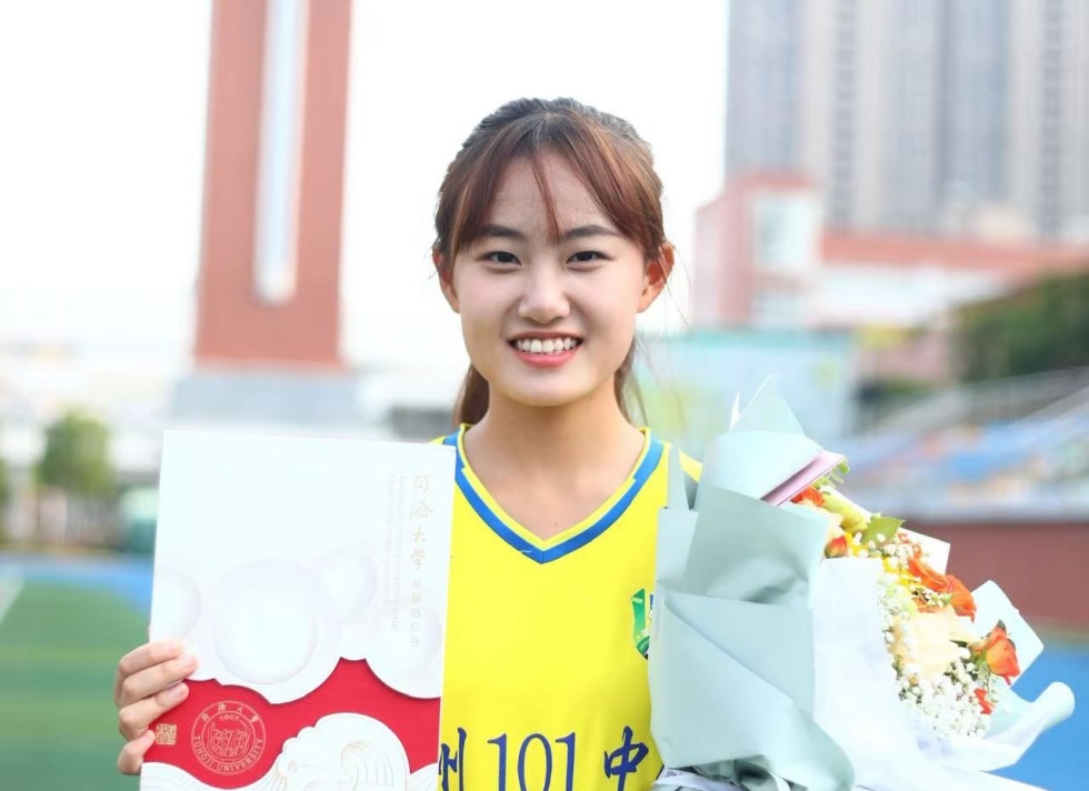 在这里,我遇见了引领我前行的良师。感谢林净教练,她不仅教会我精湛的球技,更铸就了我永不言败的信念;感谢王少华老师,用专业的指导与耐心的陪伴,助我在体育道路上不断突破;感谢班主任王兵老师,在他的引导下,我学会了如何平衡学业与训练。这一切,都离不开母校“因材施教”的育人智慧——为我们量身定制学习与训练计划,各科老师主动补讲落下的知识点,耐心解答每一个疑问,让我们在提升足球技能的同时,文化课也稳步提升,真正实现了“文体兼修”,有效助力我们实现了升学梦想。